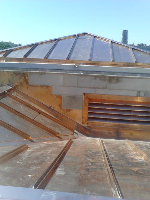 Installed new custom batten seam copper roof with mechanically locked seams. Installed custom copper trough gutters.